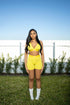 Turn heads in the Text Me set — where sunshine meets sass. This radiant yellow ribbed two-piece is made to flatter your curves and boost your mood. The plunging V-neck bralette offers a bold yet supportive look, while the high-waisted biker shorts hug your hips like a second skin. Whether you’re lounging, vibing, or stepping out, this set is all about bold energy and unapologetic confidence.